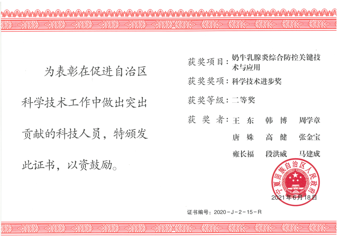 王东研究员主持的《奶牛乳腺炎综合防控关键技术与应用》项目,主要针对奶牛乳腺炎的病原生物学、细菌的耐药性以及综合防治开展科技攻关。该项目获授权国家专利6项,获兽药产品批准文号12个,发表学术论文40余篇,其中在该领域高水平刊物收录8篇,获宁夏自然科学优秀学术论文一等奖1项。先后培养研究生和本科生18名。项目研究成果在银川市、吴忠市和中卫市推广应用,累计在20.36万头奶牛中进行了示范和推广,创造经济效益1.56亿元,取得了显著的社会效益和经济效益。