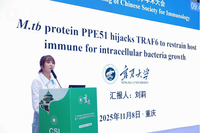 会议期间,参会师生积极参与多个分会场的学术交流活动。其中,刘莉同学在本次大会“感染免疫”分会场作了题为《M.tbprotein PPE51 hijacks TRAF6 to restrain host immune for intracellular bacteria growth》的汇报,系统介绍了在“结核分枝杆菌菌体与宿主相互博弈”理念下,结核分枝杆菌蛋白PPE51通过劫持TRAF6抑制宿主免疫,促进结核分枝杆菌的胞内存活机制,引起了同行研究者的广泛关注,并与多位国内知名专家进行了深入交流。