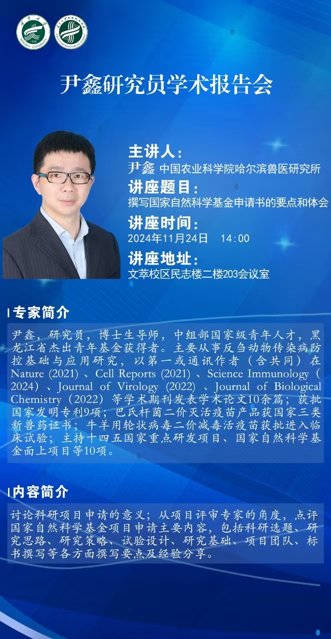 尹鑫,研究员,博士生导师,中组部国家级青年人才,黑龙江省杰出青年基金获得者。主要从事反刍动物传染病防控基础与应用研究,以第一或通讯作者(含共同)在Nature (2021) 、Cell Reports (2021) 、Science Immunology(2024)、Journal of Virology (2022) 、Journal of Biological Chemistry(2022)等学术期刊发表学术论文10余篇;获批国家发明专利9项;巴氏杆菌二价灭活疫苗产品获国家三类新兽药证书;牛羊用轮状病毒二价减毒活疫苗获批进入临床试验;主持十四五国家重点研发项目、国家自然科学基金面上项目等10项。